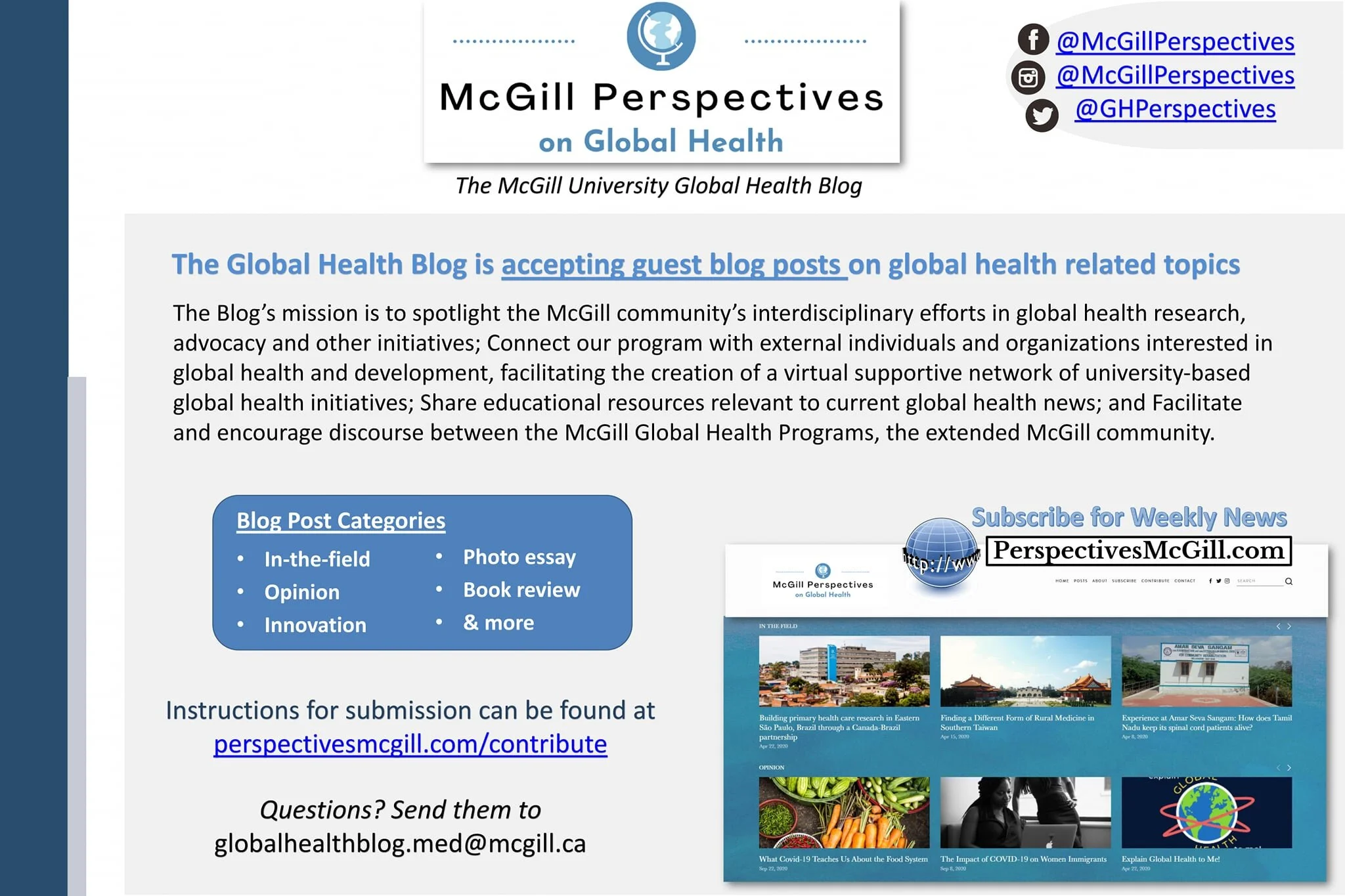McGill Global Health Perspectives welcomes contributions relevant to global health. We understand that global health is a diverse and interdisciplinary field. Thus, we welcome your contribution despite your field, as long as it pertains to global health. Contributions to Global Health Perspectives should be relevant to its mission and can include perspectives from your latest research, research experience, key issues in health policy governance, equity-related challenges, and strengths in global health to name a few.